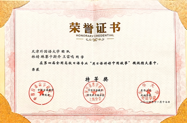 近日,第四届全国高校日语专业“用日语讲好中国故事”微视频大赛决赛在上海举行。由米兰网页版日语学院教师吹户真实、初相娟指导,2022级本科生林婧、琳赛卡斯丹、王雷鸣3名同学组成的参赛队伍在大赛中荣获全国总冠军(特等奖)。这也是天外连续三年在该项赛事中摘得全国总冠军的桂冠。全国高校日语专业“用日语讲好中国故事”微视频大赛旨在提升学生日语水平,培养新时代外语学习者的文化自信与家国情怀。大赛着重强调从多角度展现中华文明的精神内涵与文化精华,主动传播中国声音,讲述中国故事,深化中外文明交流互鉴,向世界呈现富有活力、魅力、实力的中国形象,助推中国文化在全球范围内的广泛传播。本次大赛分为初赛、决赛和即席问答三个部分。初赛以“假如有一台时光机”为主题,以日语讲述中国的历史、文化或未来发展。参赛学生以《弈谈方圆,将帅无悔》为题,巧用初赛关键词“时光机”,讲述传统文化象棋中落子无悔、运筹帷幄的生命考量以及国际外交的哲理。最终,从54所参赛高校中脱颖而出,成功晋级决赛。决赛以“我眼中的新国潮”为题,创作微视频作品,展现学生的日语实践能力和对中华优秀传统文化的深厚理解力。参赛学生以“中式香薰”为中心,在限