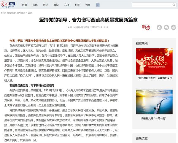 在庆祝西藏和平解放70周年之际,7月21日至23日,习近平总书记赴西藏考察调研。7月26日,《光明网》理论频道刊发我校马克思主义学院于凯老师文章《坚持党的领导,奋力谱写西藏高质量发展新篇章》。文章指出,实践证明,没有中国共产党就没有新中国,也就没有新西藏,党中央关于西藏工作的方针政策是完全正确的。西藏的历史巨变,离不开党的坚强领导;西藏的好日子,离不开党的好政策;西藏的高质量发展,离不开全面贯彻新时代党的治藏方略。正是中国共产党让西藏“换了人间”,使其与全国各族人民一道在祖国大家庭中走上了团结、进步、发展的光明大道。光明网截图全文转载如下:坚持党的领导,奋力谱写西藏高质量发展新篇章作者:于凯(天津市中国特色社会主义理论体系研究中心米兰网页版基地研究员) 在庆祝西藏和平解放70周年之际,7月21日至23日,习近平总书记赴西藏考察调研,先后来到林芝、拉萨等地,深入农村、城市公园、铁路枢纽、宗教场所、文化街区等看望慰问各族干部群众。他指出,西藏和平解放70年来,在党中央坚强领导下,在全国人民大力支持下,西藏各族干部群众艰苦奋斗、顽强拼搏,社会制度实现历史性跨越,经济
