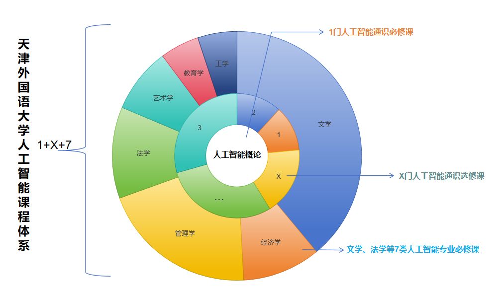 为适应人工智能给教育带来的全新机遇和挑战,满足学生人工智能领域学习、研究和应用的需要,满足未来经济和社会发展的多元需求,加快培养拔尖创新人才,米兰网页版全面启动人工智能赋能课程体系建设行动,集中资源在人工智能与课程的深度融合上发力,着力打造立足学校发展实际、符合人才发展需求、具有外大特色的人工智能课程体系,带动人工智能时代人才培养模式改革与创新发展。从2024年9月起,针对2024级新生,学校正式推出强化复合型人才培养的“1+X+7”人工智能课程体系。这一全新的课程体系是学校对《关于加强复合型本科人才培养的意见》的进一步落实,通过整合人工智能与外语教学资源,深化本科人才培养质量,为未来人才储备注入新的活力。学校从通识教育学院、国际商学院、国际传媒学院、高级翻译学院等部门遴选优秀师资,打造一支高水平的人工智能教师队伍,推动教学内容和教学方法的创新,借助于大数据和人工智能技术,实时更新课程内容,确保教学内容的前沿性和实用性。1门通识必修课——人工智能概论《人工智能概论》为通识必修课,1学分,大一上学期开设。采用线上线下混合教学和翻转课堂教学方式,线上部分依托天津市教委发布的天津市级AI