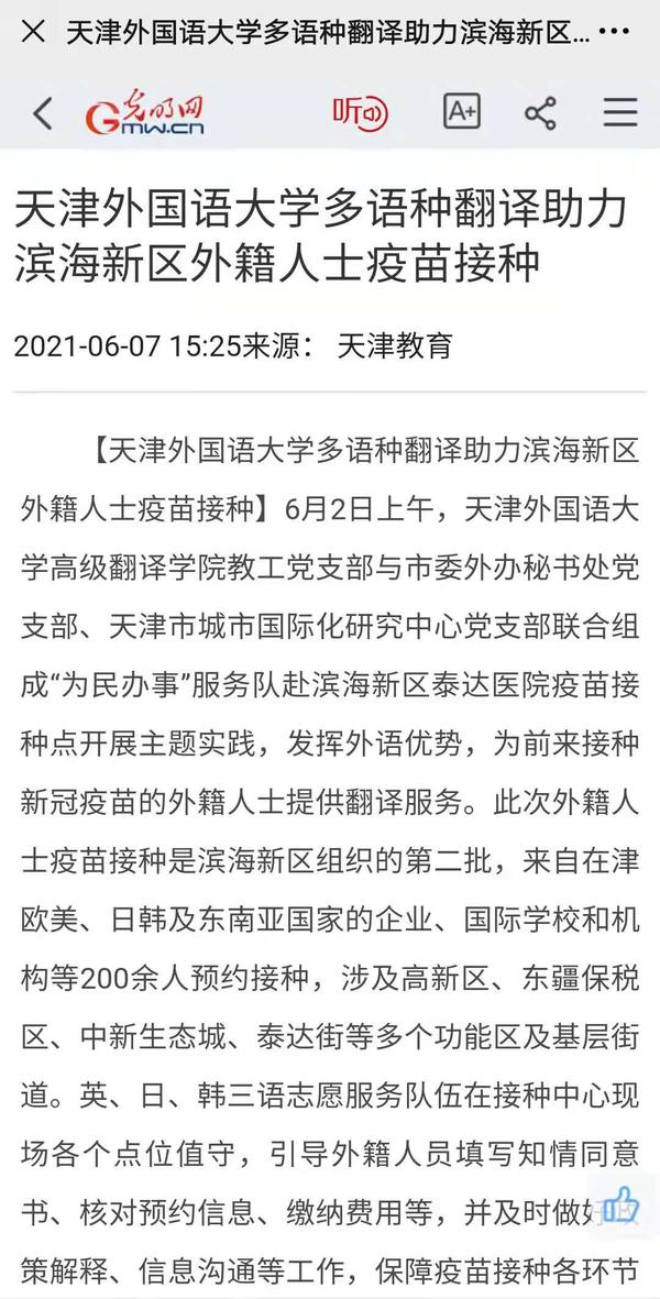 近日,我校高级翻译学院教工党支部与市委外办秘书处党支部、天津市城市国际化研究中心党支部联合组成“为民办事”服务队赴滨海新区泰达医院疫苗接种点开展主题实践,发挥外语优势,为前来接种新冠疫苗的外籍人士提供翻译服务。光明网对此进行了报道。