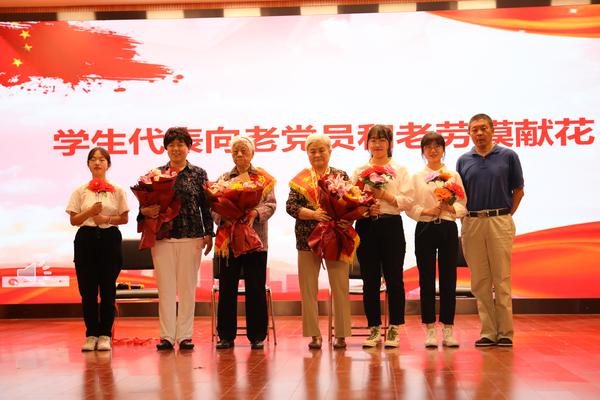 交流互动环节中,同学们异常踊跃,气氛热烈,分别从党性修养、服务社会、人生价值等不同方面与老劳模们亲切交流,寻根溯源,领悟初心。校延安精神研究会代表温晨在发言中表示,将会坚定目标,努力传承、发扬劳模精神,展示新时代青年学子良好的精神风貌。老劳模们为毕业生代表送上寄语,并向学生党员代表赠送了手工制作的牡丹花,亲手为学生们佩戴上党徽。学生代表向老劳模们献花致敬。