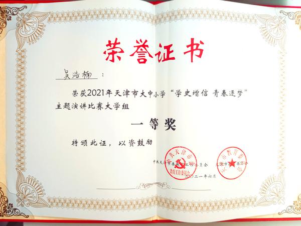 为庆祝中国共产党成立100周年,6月9日,由市教育两委举办的2021年天津市大中小学“学史增信 青春逐梦”主题演讲比赛决赛在天津广播电视台举行。经过激烈角逐,我校国际传媒学院吴浩楠同学在大学组的决赛中脱颖而出,最终斩获一等奖。