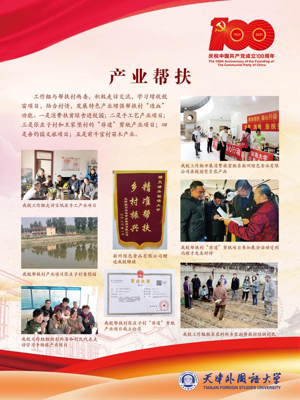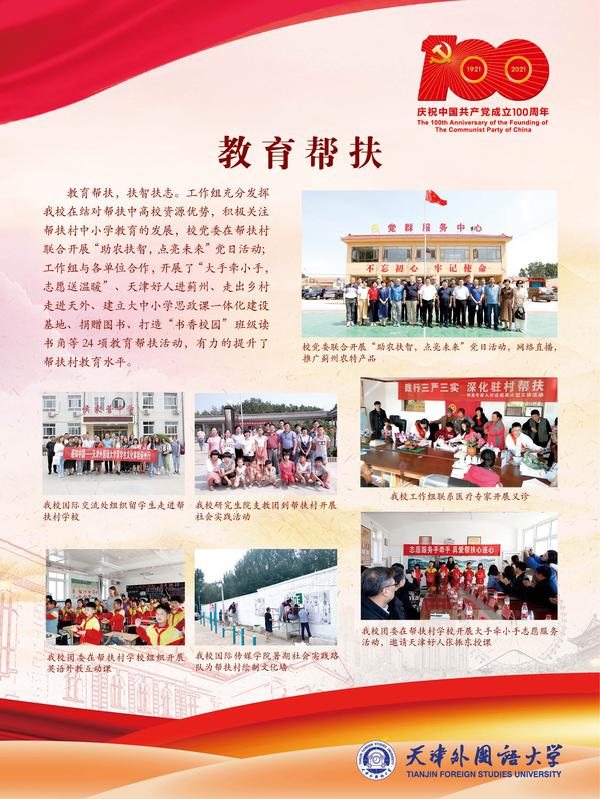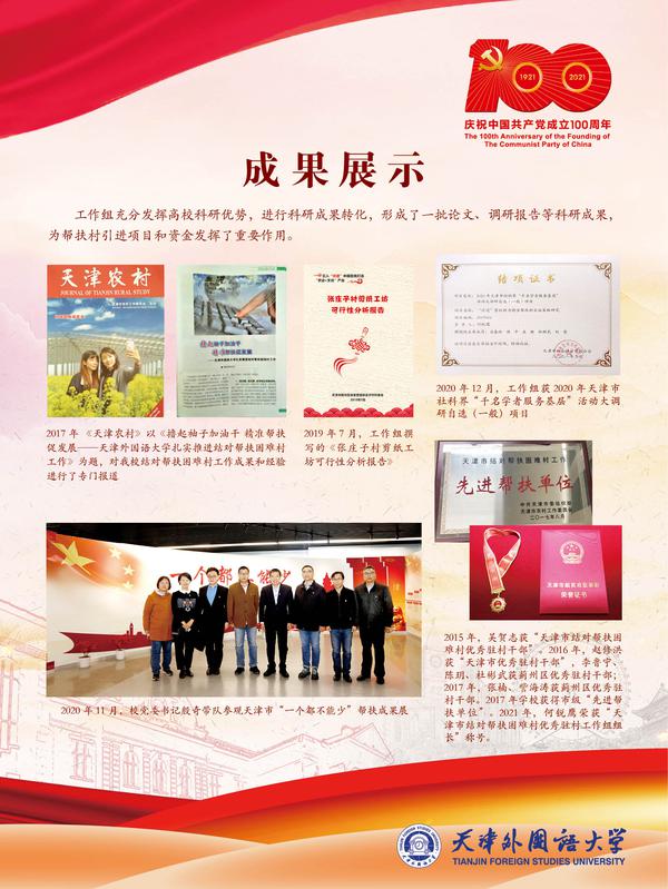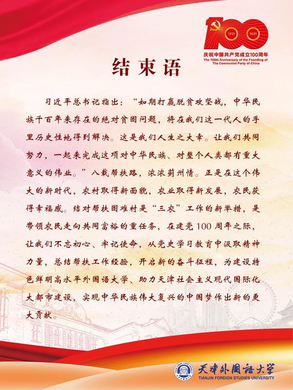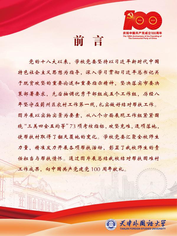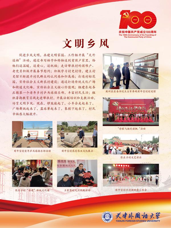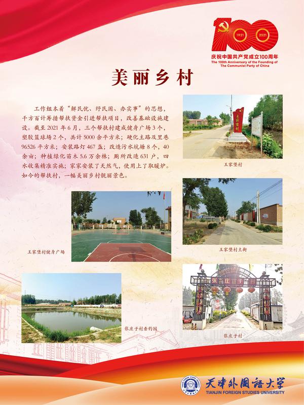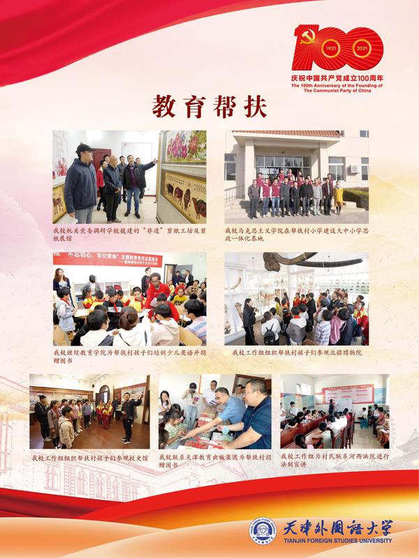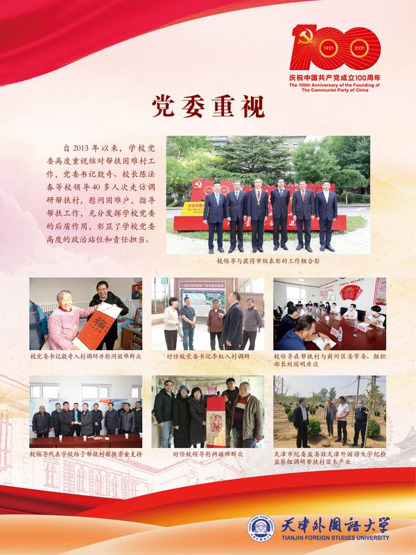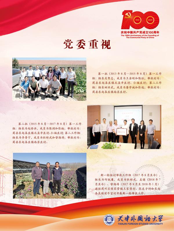 五个工作组,八年接续奋斗,有这样一群人,他们舍小家为大家,与村民同吃、同住、同劳动、同学习,被村民誉为“老百姓的贴心人”,在蓟州的土地上书写了脱贫攻坚的天外实践。为庆祝中国共产党成立100周年,驻村帮扶工作组联合党委组织部、党委宣传部主办题为“八年帮扶聚情怀 脱贫攻坚展风采”------米兰网页版结对帮扶困难村工作图片展,以实物实景为要素,从八个方面展现工作组紧紧围绕“三美四全五均等”73项考核指标,攻坚克难,逐项落地,使帮扶村取得了翻天覆地的变化,彰显了我校师生的责任担当与帮扶情怀。站在新的历史起点,天外人不忘初心,牢记使命,总结帮扶工作经验,开启新的奋斗征程,为建设特色鲜明高水平外国语大学、助力天津社会主义现代国际化大都市建设,实现中华民族伟大复兴的中国梦作出新的更大贡献。