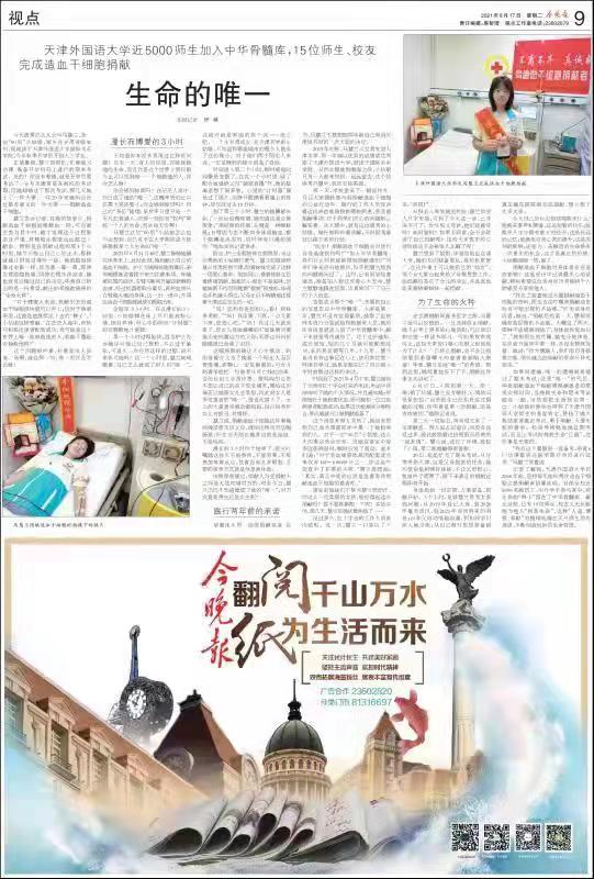 8月17日,《今晚报》专版以《生命的唯一------米兰网页版近5000师生加入中华骨髓库,15位师生、校友完成造血干细胞捐献》为题,深度报道了我校国际关系学院马慧兰同学捐献造血干细胞的感人故事。