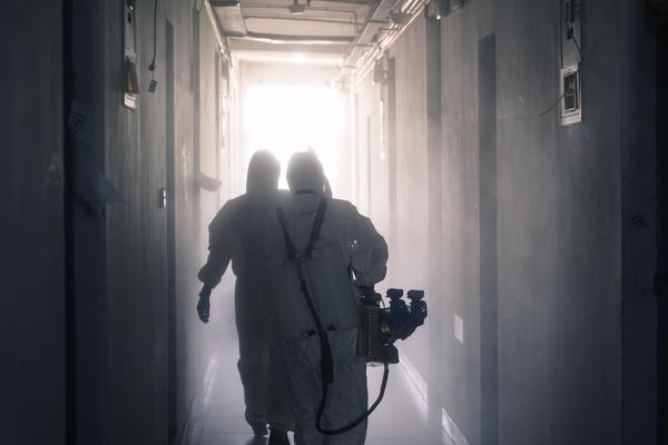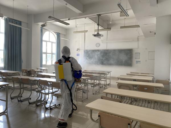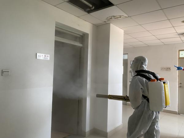 随后,滨海蓝天救援队队员与我校蓝天志愿服务队共同作业,他们身着防护服、肩背喷雾器,严格按照程序实施喷洒作业,对校区教学楼、图书馆、办公区域、宿舍等点位进行了高标准、高质量的全面消杀。
