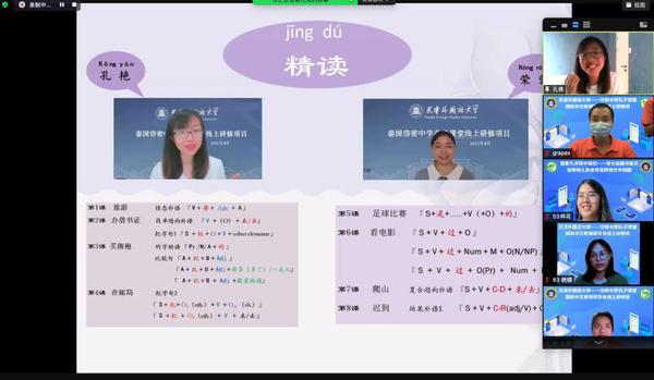 参加开幕式的还有泰国博仁大学秘书长蓬萨、泰国岱密孔子课堂负责人宋嘉彬、我校国际合作与交流处处长张占奇、国际传媒学院党委书记孙雪颖、院长马兰州、任课教师代表张洋、孔艳。开幕式由国际传媒学院副院长王芳主持。开幕式结束后,孔艳老师为学生进行第一次线上直播课教学,孔老师准备充分,课程设计生动有趣,与学生形成良好的互动。在未来一个月的项目学习中,泰国学员将在语言课程、文化课程和实境课程中学习汉语,在富有中国传统文化特色的故事中加深对中国文化的了解。