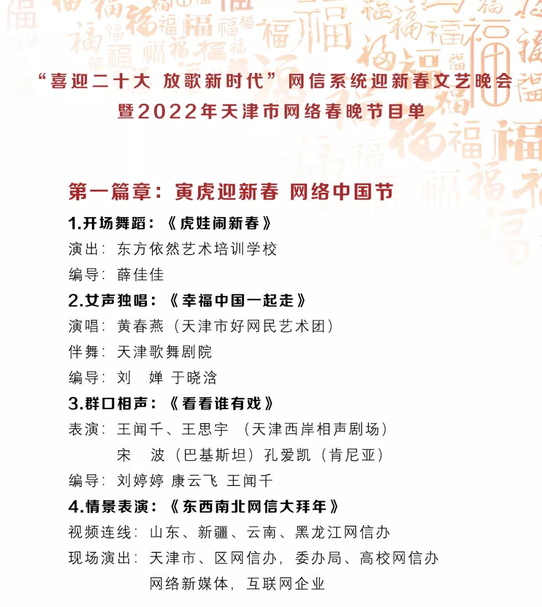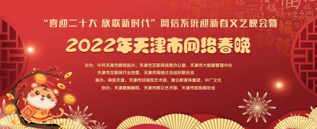 今天是农历除夕,由天津市委网信办、天津市互联网信息办公室、天津市大数据管理中心、天津市互联网行业党委、天津市网络社会组织联合会共同主办的“喜迎二十大 放歌新时代”2022天津市网络春晚暨网信系统迎新春文艺晚会于今晚隆重推出,向广大网友和观众朋友们祝贺新春。