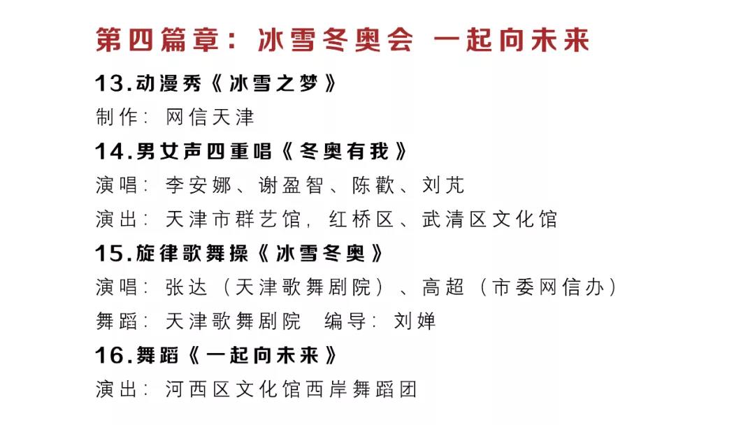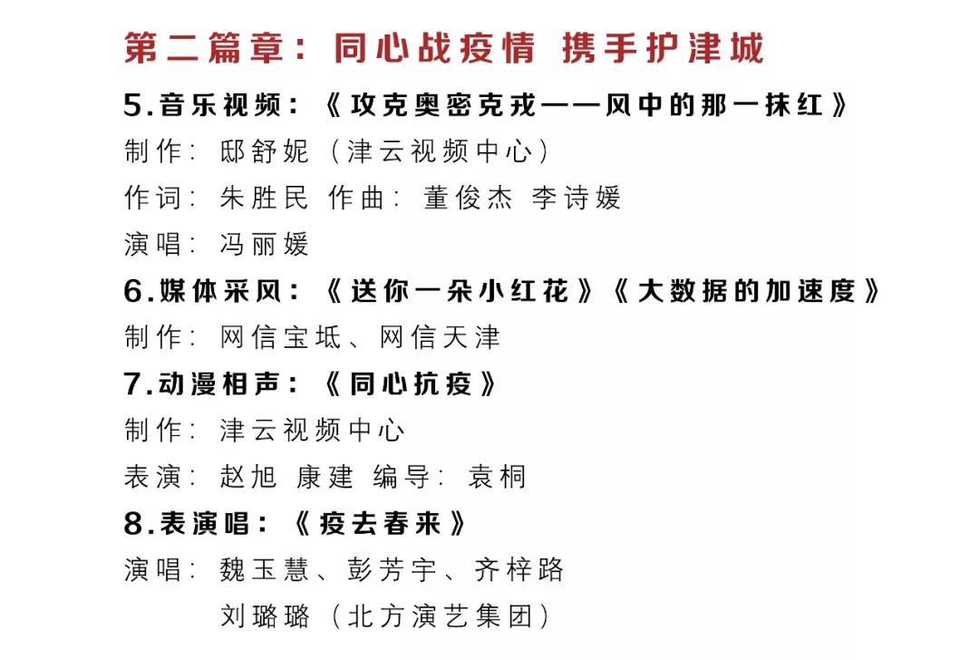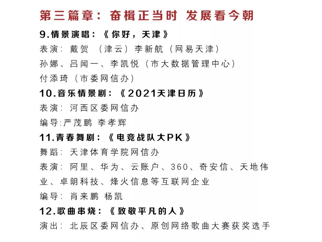 天津市网络春晚自2018年开始已连续举办五年,是网信战线的一场文化盛会。今年的晚会由《寅虎迎新春,网络中国节》《同心战疫情,携手护津城》《奋楫正当时,发展看今朝》《冰雪冬奥会,一起向未来》《喜迎二十大,启航新征程》五个篇章组成。除少数专业院团演员参演外,大部分节目由网信系统的机关干部、媒体编辑、高校师生、互联网企业员工和好网民志愿者演出。