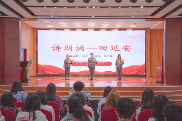 校诚信教育宣讲社的杨羽、王翰仪、刘思缘3名同学伴着婉转的旋律,声情并茂地朗诵了《回延安》,将现场每一位同学带入了歌颂延安精神、弘扬红色文化的高昂旋律中。