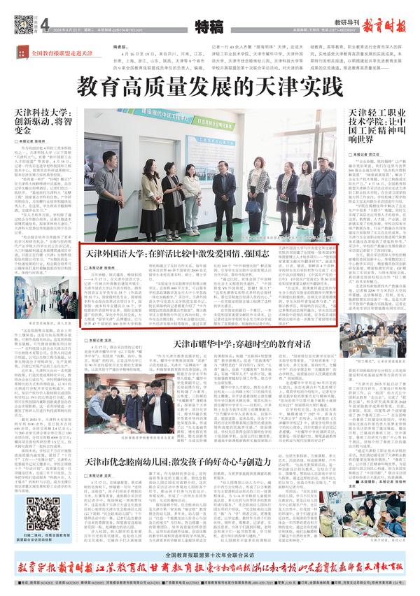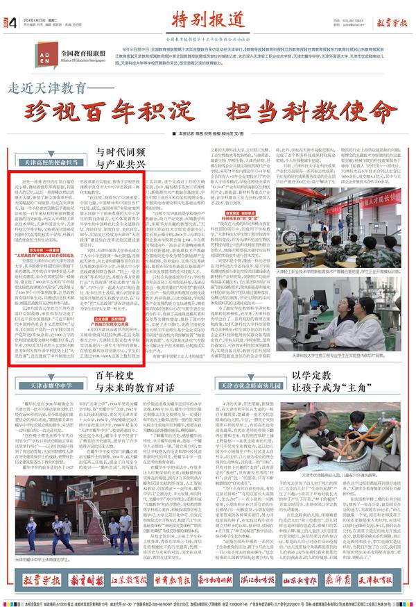 4月16日—19日,全国教育报联盟第十次年会暨联合采访活动在天津举行。《教育导报》《教育时报》《江苏教育报》《甘肃教育报》《东方教育时报》《山东教育报》《浙江教育报》《教师报》《天津教育报》的相关负责人、编辑、记者一行40余人,先后走进天津轻工职业技术学院、天津市耀华中学、米兰网页版、天津优念睦南幼儿园、天津科技大学开展联合采访,了解天津市各级各类学校办学理念,感受天津教育发展脉搏。近日,上述媒体陆续对此次活动及相关院校进行了详细报道。