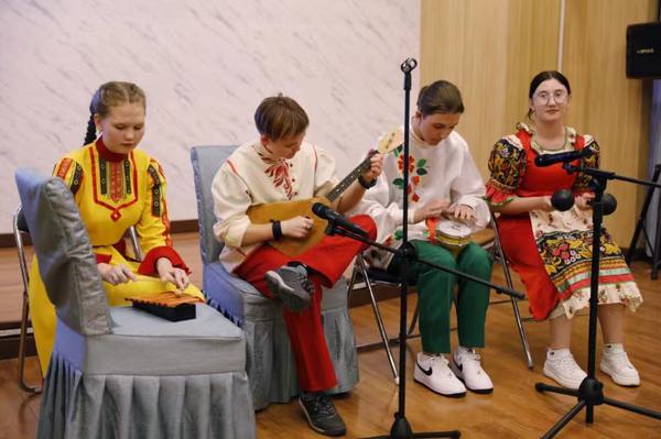 “小鹰”团组营员雅·德·米罗什尼琴科、索·谢·西多连科表演了哥萨克舞蹈,尤·扎·扎姆拉金、玛·谢·什罗科娃表演了华尔兹舞蹈,克·罗·博卡列娃演唱了歌曲《卡林卡》,达·日·费德洛娃、玛·谢·什罗科娃、安·罗·兹维亚金、卡·阿·塔赫玛金表演了俄罗斯民乐《月光流淌》。我校欧洲语言文化学院俄语专业学生吾克莱用民族乐器冬不拉演奏了曲目?aday ? ,王美吉演唱了俄语歌曲《我爱你》, 卢怡宁用中俄双语演唱了歌曲《贝加尔湖》,中俄双方师生共同表演了歌伴舞《喀秋莎》,一个又一个精彩的节目将欢送会现场气氛不断推向高潮。