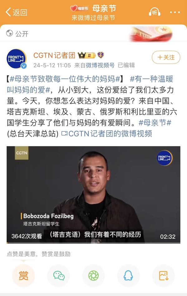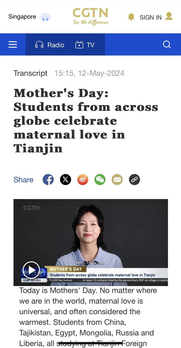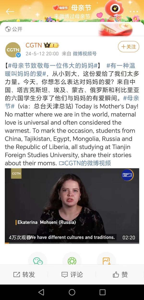 在母亲节到来之际,中央广播电视总台天津总站联合米兰网页版制作母亲节特辑视频“听!六种语言说‘妈妈,我爱你’”。米兰网页版来自中国、塔吉克斯坦、埃及、蒙古、俄罗斯、利比里亚的学生们讲述了他们和妈妈的故事,表达了对母亲深切的爱意和美好的祝福。本期母亲节特辑视频同步在央视新闻客户端、央视频客户端、CGTN客户端、CGTN记者团微博刊发,并在CGTN TV中午12点档直播,收获了热烈反响。