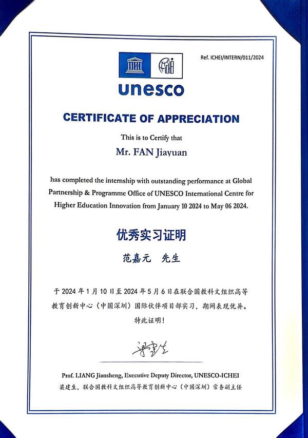 2020级外交学专业本科生范嘉元通过简历初审、部门负责人面试,于2024年1月10日被联合国教科文组织高等教育创新中心(中国深圳)国际伙伴项目部录用为实习生,开展了为期4个月的“线上+线下”实习。在职期间,他协助项目专家搜集中心在东南亚、中东、太平洋岛国开展合作项目所需的信息,撰写高等教育政策国别调研约1万字;协助完成工作资料的整理、翻译、编辑和校对,起草会议纪要15份,各类工作文档近百件;参与东南亚地区高级别政策对话会筹备与执行,撰写会议概念文件、日程手册和新闻稿,并为中心领导访问地区国家起草谈话参考;参与埃塞俄比亚教育部长、沙特苏尔坦亲王大学代表团接待工作。范嘉元同学实习业绩得到中心领导、同事一致肯定,获评优秀实习生。