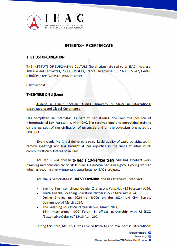 2021级国际组织与全球治理专业的李欣同学成功获得Institute of Euro-Asian Culture-IEAC(法国巴黎欧亚文化研究所)非政府组织的实习机会,于2024年1月至4月进行了3个月的远程实习。实习期间,李欣担任该组织国际法项目助理,并担任10人小组实习生的组长,参与由联合国教科文组织举办的有关性别平等、绿色教育、非政府组织论坛等多项国际会议并负责会议记录,参与多场学术研讨会,负责联合国未来峰会与教科文组织教席活动的相关筹备工作,并在实习结束提交全英文国际法学术论文,获得主管高度认可与组织最高级别的实习生表彰。
