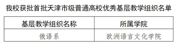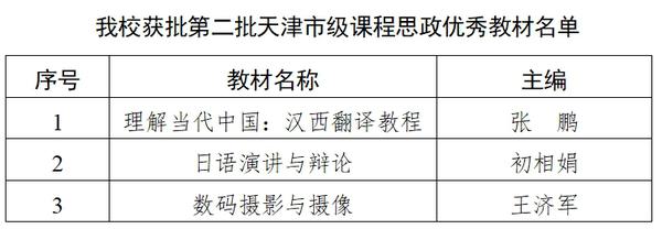 近日,市教委公布第二批天津市级课程思政示范课程及课程思政优秀教材、首批天津市级课程思政优秀教学案例、首批天津市级普通高校优秀基层教学组织、首批天津市级普通高校精品教材建设项目等5项评选结果,我校《日语阅读与思辨》等4门课程获批天津市级课程思政示范课程,《理解当代中国:汉西翻译教程》等3部教材获批天津市级课程思政优秀教材,“从《狼来了》到《烽火戏诸侯》的概率论解读—贝叶斯公式应用”等2个教学案例获批天津市级课程思政优秀案例,俄语系获批天津市级普通高校优秀基层教学组织,《高级韩国语视听说》等2部教材获批天津市普通高校精品教材建设项目。