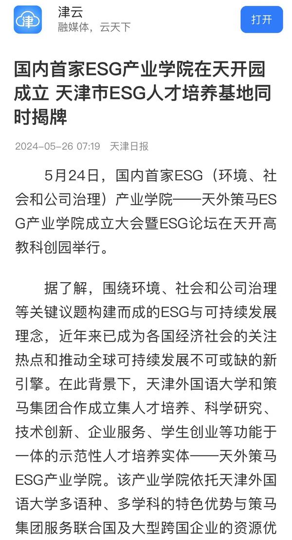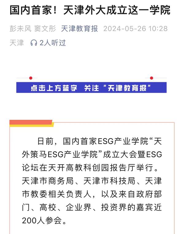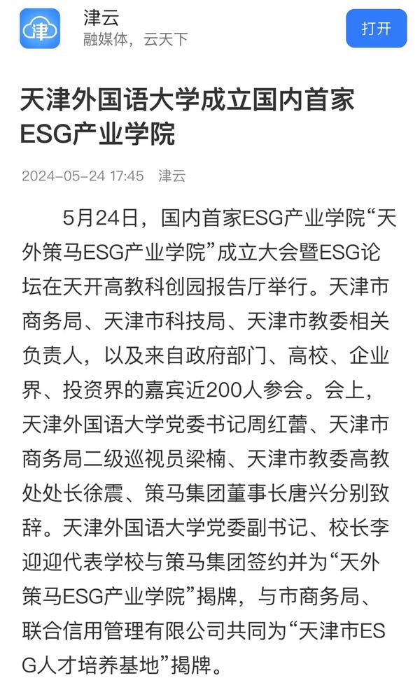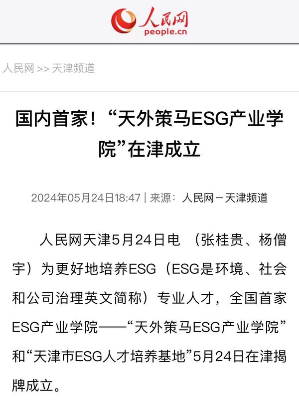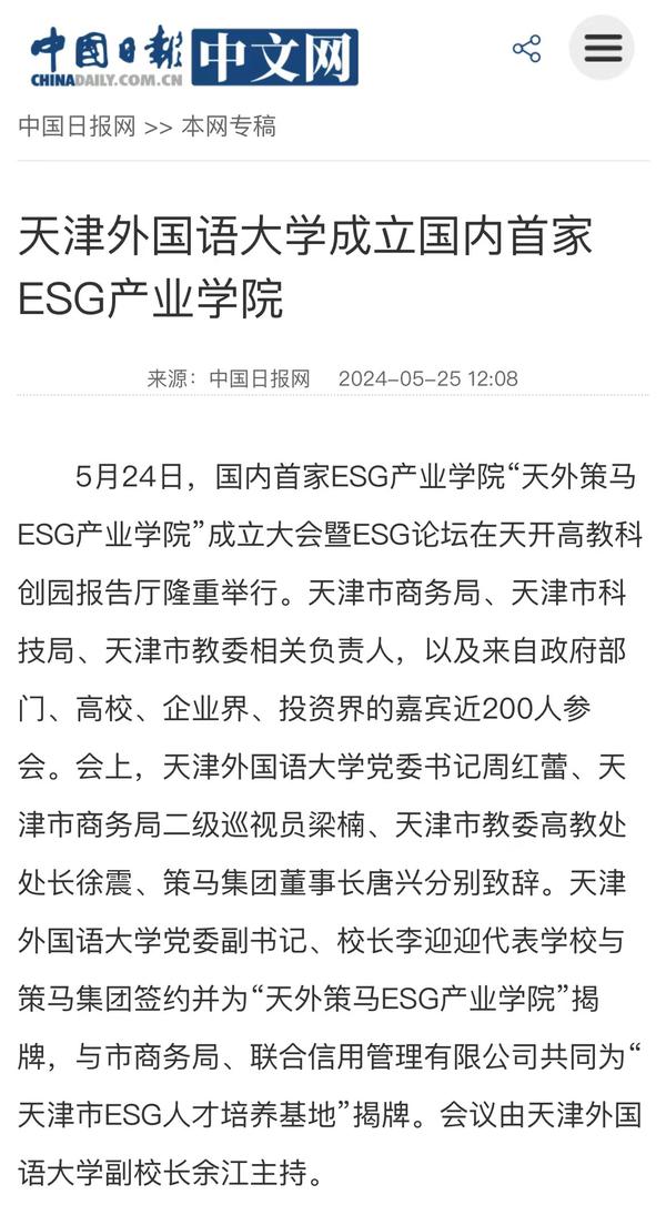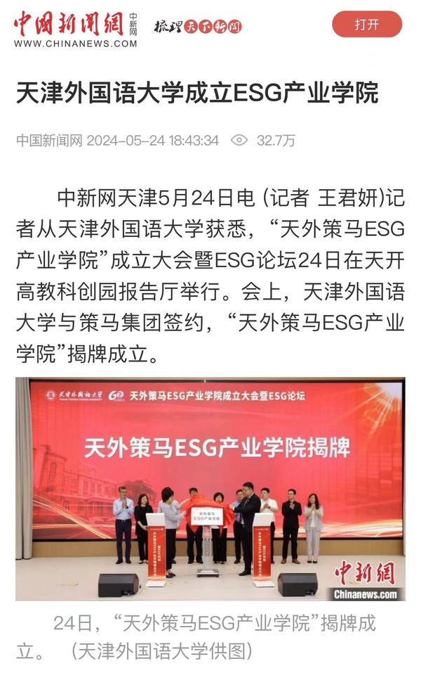 5月24日,国内首家ESG产业学院“天外策马ESG产业学院”成立大会暨ESG论坛在天开高教科创园报告厅隆重举行。该产业学院依托米兰网页版多语种多学科特色优势与策马集团服务联合国及大型跨国企业的资源优势,构建全方位、全链条、深融合的产学研用协同育人新机制,培养具有ESG知识与实务技能的跨学科、跨领域、复合型的国际化ESG人才。人民日报客户端、人民网、新华社客户端、光明日报客户端、光明日报微信公众号、中国新闻网、中国日报网、央广网、天津日报、津云、天津教育报、网易新闻、北青网等多家媒体对此进行了报道。
