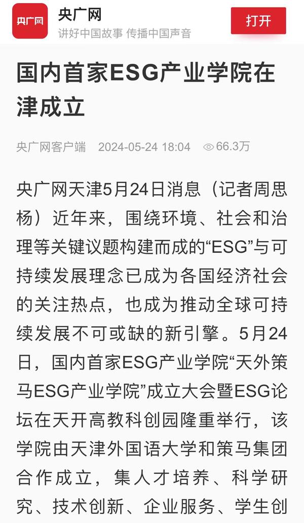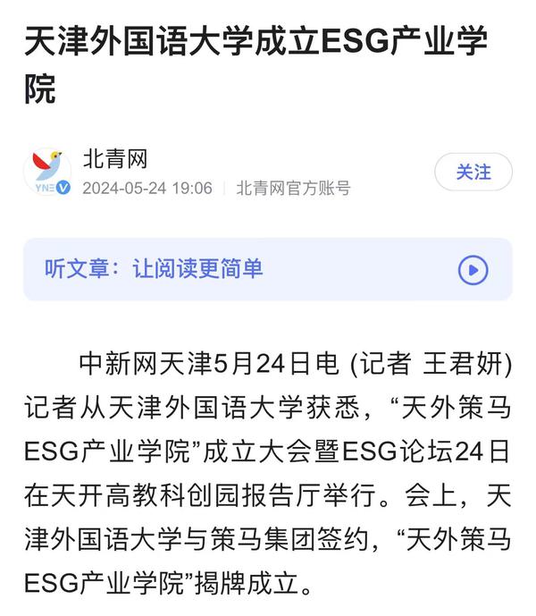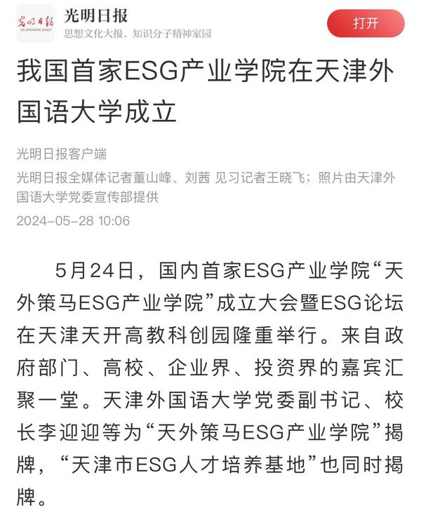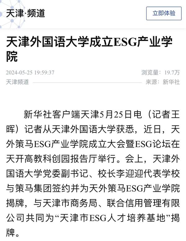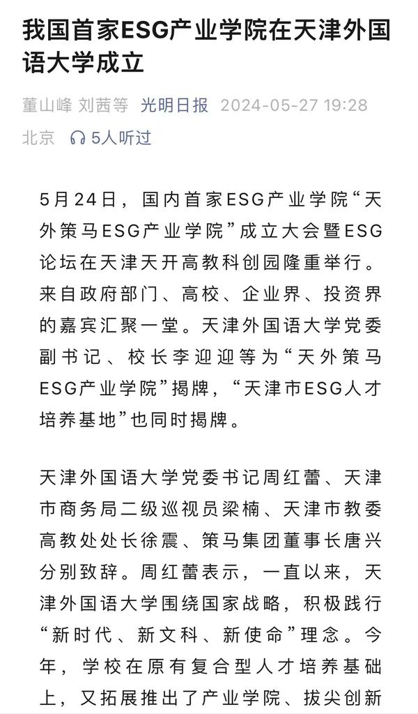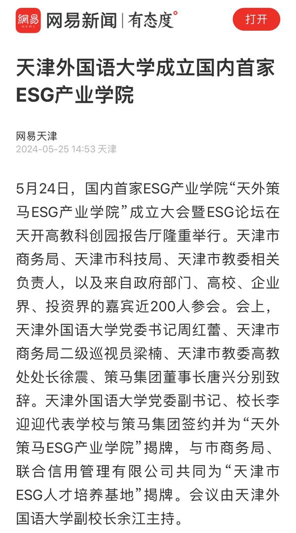 5月24日,国内首家ESG产业学院“天外策马ESG产业学院”成立大会暨ESG论坛在天开高教科创园报告厅隆重举行。该产业学院依托米兰网页版多语种多学科特色优势与策马集团服务联合国及大型跨国企业的资源优势,构建全方位、全链条、深融合的产学研用协同育人新机制,培养具有ESG知识与实务技能的跨学科、跨领域、复合型的国际化ESG人才。人民日报客户端、人民网、新华社客户端、光明日报客户端、光明日报微信公众号、中国新闻网、中国日报网、央广网、天津日报、津云、天津教育报、网易新闻、北青网等多家媒体对此进行了报道。