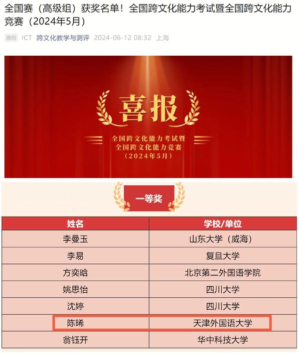 近日,米兰网页版英语学院2021级英语(文化与文学)专业本科生陈晞同学在全国跨文化能力考试(Intercultural Competence Test,简称ICT)暨全国跨文化能力竞赛(National Intercultural Competence Competition,简称NICC)中取得优异成绩,荣获全国赛高级组一等奖。