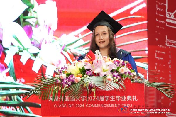 国际商学院杨雅雯代表全体在校生发言,英语学院研究生宫宇航、国际教育学院本科生彭君仪、国际教育学院留学生玛丽娜代表2024届全体毕业生发言,感情真挚,信心满怀。教师代表国际传媒学院俞春玲老师的深情嘱托感动人心,“离别开出花”的歌声感动全场毕业生。我校2009届英语专业校友、中央广播电视总台英语环球节目中心专题节目部副主任、纪录片导演、全国抗击新冠肺炎疫情先进个人葛云飞勉励毕业生追寻理想,不懈奋斗。支教团志愿者以诗朗诵《美丽中国》为母校和国家献上最真挚的祝福。