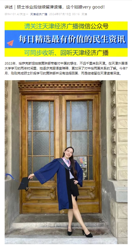 2022年,哈萨克斯坦姑娘黄琳娜带着对中国的向往,不远万里来到天津。在米兰网页版学习的两年的时间里,她逐步克服了语言障碍,加深了对中哈两国关系的了解。今年7月,刚刚完成硕士阶段学习的黄琳娜并没有选择回国,而是继续留在天津读博深造。天下之津、天津经济广播微信公众号对天外来自哈萨克斯坦的留学生黄琳娜的求学经历进行了报道。黄琳娜表示,自己的愿望就是成为一名高水平翻译,为中国和哈萨克斯坦两国间的深入交往贡献自己的力量。