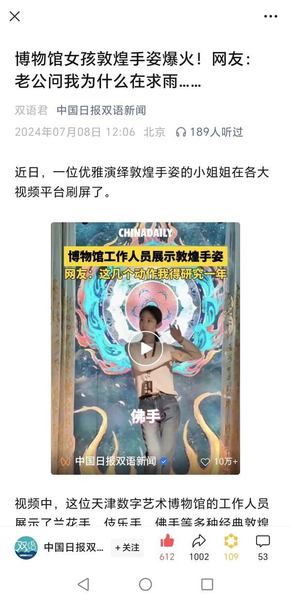 手势舞走红网络之后,崔紫雲更加坚定了传播中华传统文化的信心和决心。“一次偶然间的尝试,能得到大家的喜欢,我受宠若惊。希望更多人可以关注中国传统文化,我也会和同事们一起,借助科技的力量,继续讲好文物故事。”未来,崔紫雲计划通过更加深入的学习和研究,提升自身英语水平,以便更准确地传达敦煌文化的精髓和内涵,用世界听得懂的语言,将敦煌的辉煌历史和独特艺术传递给更多国家和地区的人们。“英语是我与世界沟通的桥梁”,崔紫雲说,“希望有一天,我能够自信地用英语向全世界讲述敦煌的传奇故事。”