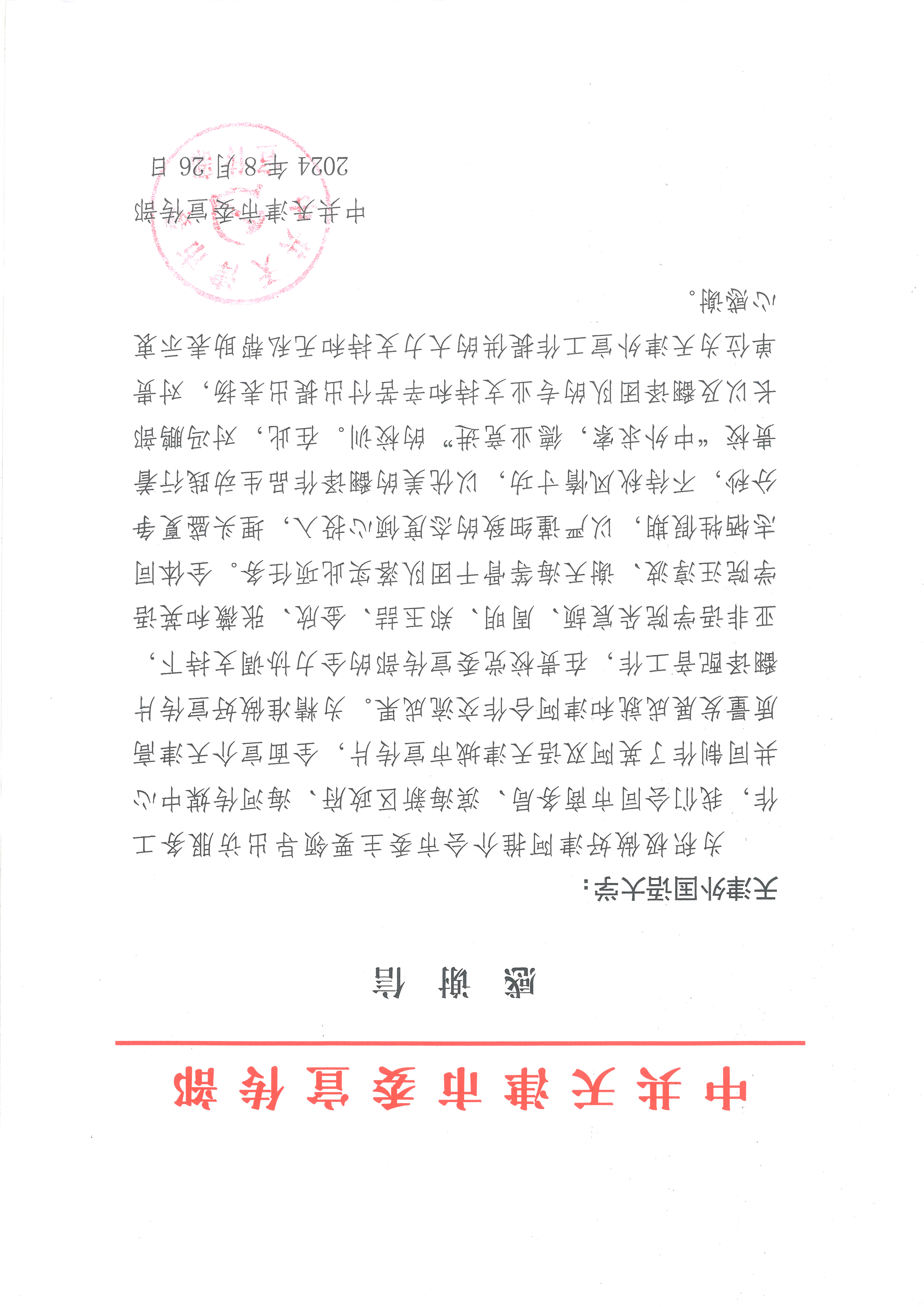 近日,市委宣传部致函我校,感谢天外翻译专班圆满完成英阿双语天津城市宣传片翻译工作。