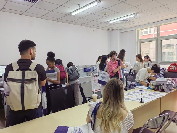 报到日,留学生办公室为新生们提供了全链条一站式注册服务,做好咨询引导、留学生与各培养单位教学对接、税号及银行卡办理指导、体检说明、签证办理说明等工作,力求做到“热情、周到、规范、高效”。报到现场井然有序、热情欢快,洋溢着国际化的青春气息。