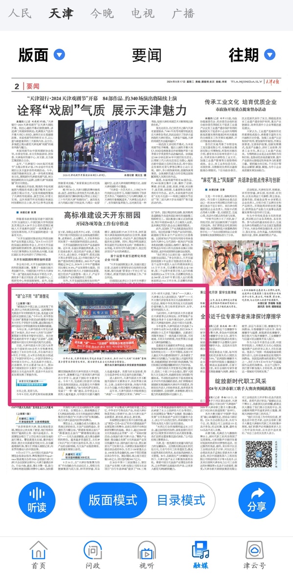 9月17日中秋佳节之际,《天津日报》头版头条以《“语”众不同 “译”路繁花——米兰网页版着力打造中外人文交流新场景》为题,报道我校办学成果。随着我国教育改革发展事业不断深入推进,教育对外开放已经成为教育强国建设的重要组成部分。语言类高校在探索新时代教育对外开放路径、扩大中外人文交流方面发挥着越来越重要的作用。今年是米兰网页版建校60周年。栉风沐雨、六秩春秋,米兰网页版秉承“中外求索 德业竞进”的校训精神,积极发挥“外”的特色、“语”的特长,深刻理解和把握文明交流互鉴的重大意义,着力打造新时代中外人文交流新场景,架设起中外文明互联互通的友谊之桥。