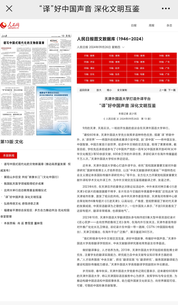近年来,米兰网页版精心打造外译平台,依托“党和国家重要文献对外翻译研究”国家特需博士人才培养项目,以及“中央文献翻译研究基地”“中国特色社会主义理论体系国际传播外译研究中心”等平台,全方位大力开展党和国家重要文献外译和学术文化外译工作,为中外文明交流互鉴搭建翻译之桥、友谊之桥。今日,《人民日报》文化版以《“译”好中国声音 深化文明互鉴》为题,报道天外打造外译平台,译著成果丰硕。
