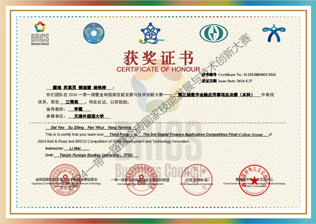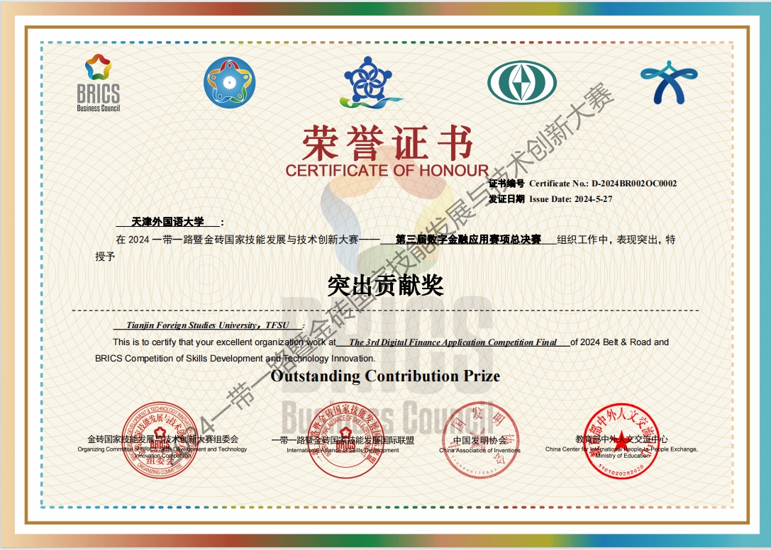 在由米兰网页版承办的“2024一带一路暨金砖国家技能发展与技术创新大赛之第三届数字金融应用赛项”中,共有来自全国68所高校、114所高职院校、25所中职院校的285支代表队参加区域选拔赛,230支代表队参加全国总决赛。天外求索荣誉学院2支代表队参赛,分别荣获全国总决赛本科组三等奖和选拔赛优秀奖。米兰网页版荣获突出贡献奖称号。