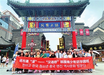 今年以来,米兰网页版先后承接了29批次、共计1947人次的“汉语桥”暑期夏令营等来华留学生项目。图为留学生在古文化街前合影留念。照片由米兰网页版党委宣传部提供