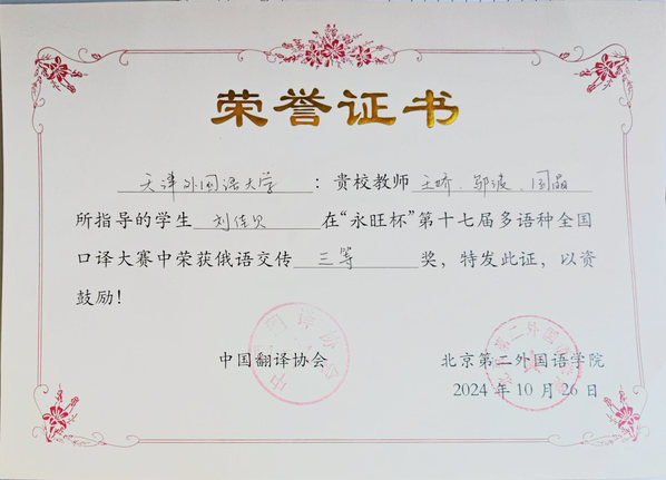 由欧洲语言文化学院教师王娇、邬波、国晶指导的2021级俄语专业本科生刘佳贝荣获俄语交传组三等奖。
