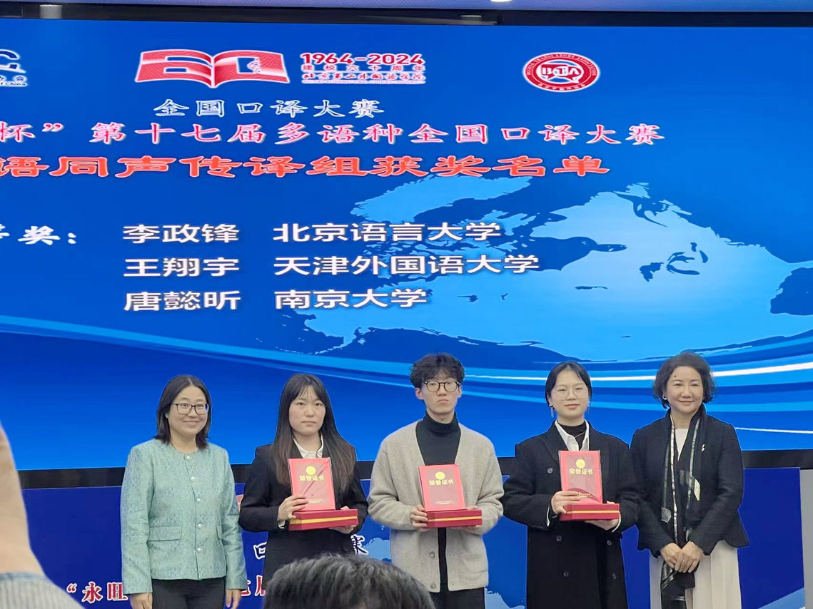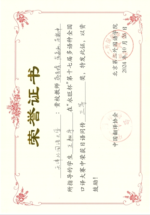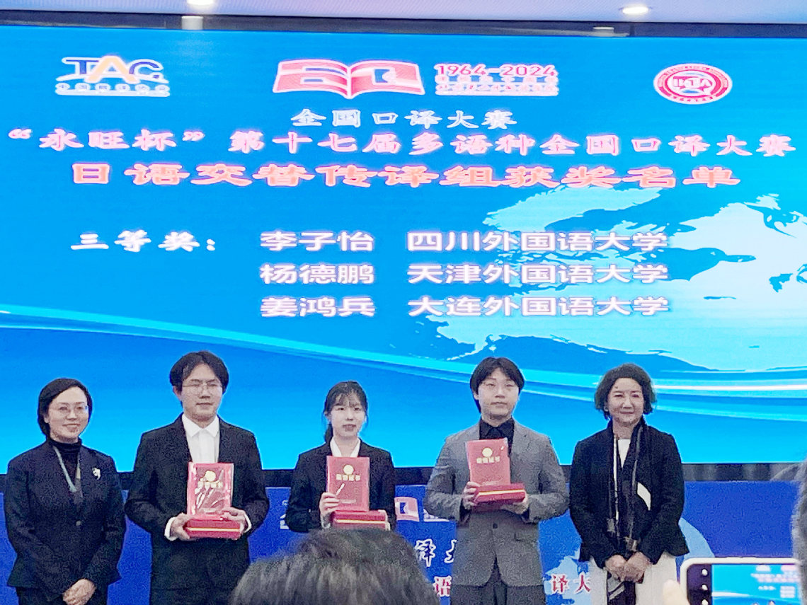 由高级翻译学院教师蒋芳婧、崔荔函、苏霖坤指导的2023级日语同声传译方向硕士研究生王翔宇荣获日语同传组三等奖,2023级日语口译专业硕士研究生杨德鹏荣获日语交传组三等奖。