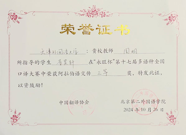 由亚非语学院教师周明指导的阿拉伯语系2023级硕士研究生李昊轩荣获阿拉伯语交传组三等奖。