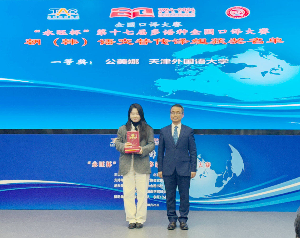 由亚非语学院教师李芳、金慧子、高晓婷指导的韩语系2023级口译方向硕士研究生公美娜荣获朝(韩)语交传组一等奖。