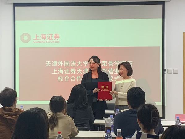 聘请上海证券天津营业部业务经理陈静为行业导师,并为其颁发了聘书。