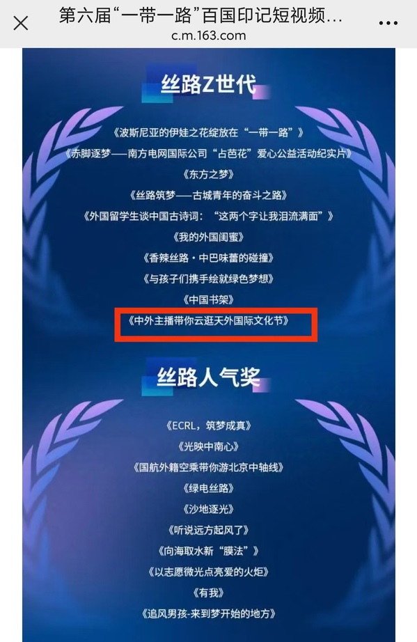近日,第六届“一带一路”百国印记短视频大赛获奖名单正式揭晓。由米兰网页版党委宣传部、天外学生记者团制作的视频作品《中外主播带你云逛天外国际文化节》荣获丝路Z世代奖!