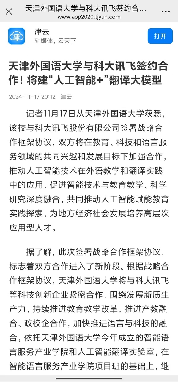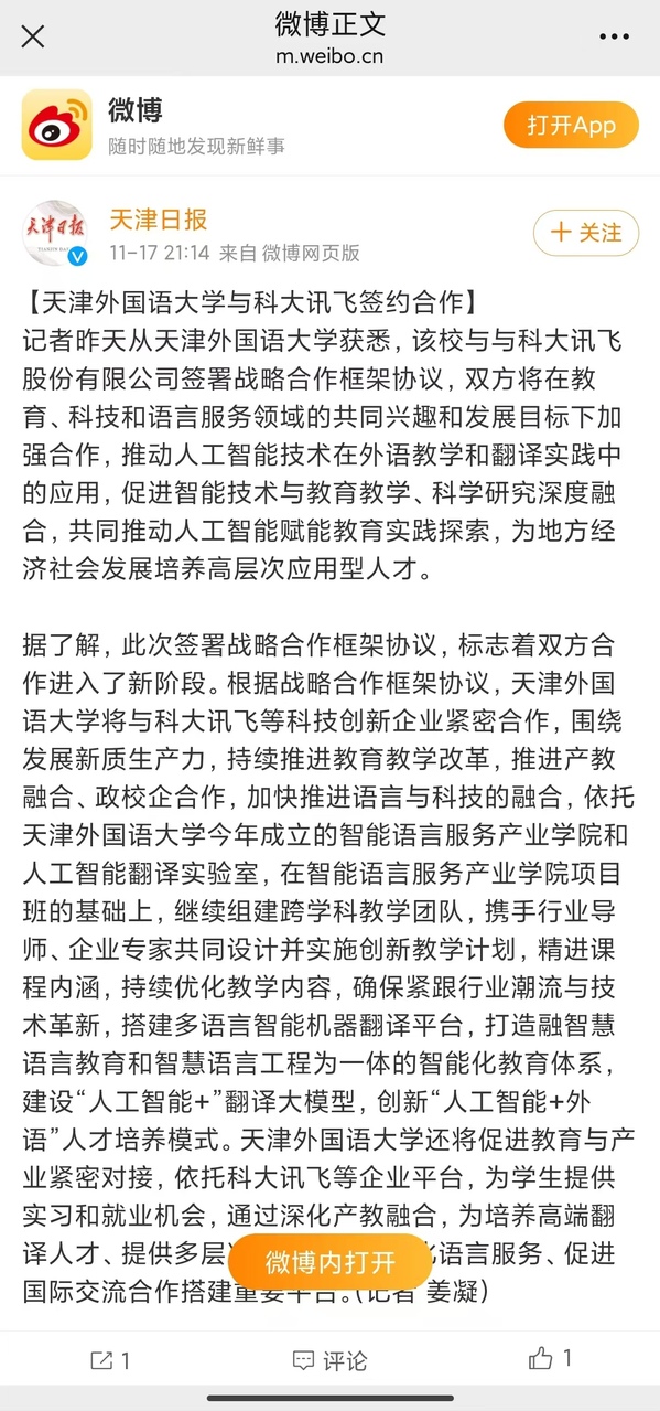 近日,米兰网页版与科大讯飞股份有限公司签署战略合作框架协议,双方将在教育、科技和语言服务领域的共同兴趣和发展目标下加强合作,推动人工智能技术在外语教学和翻译实践中的应用,促进智能技术与教育教学、科学研究深度融合,共同推动人工智能赋能教育实践探索,为地方经济社会发展培养高层次应用型人才。本次合作受到《天津新闻》、天津新闻频道《都市报道60分》、《天津日报》、《天津日报》官方微博、津云、《天津教育报》等多家媒体的关注和报道。