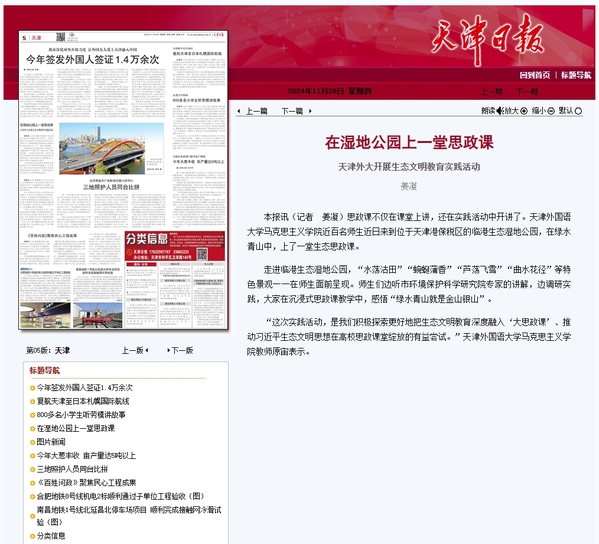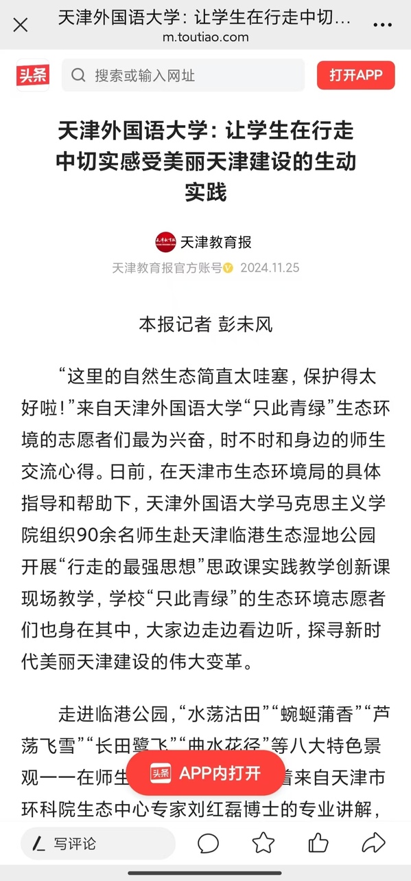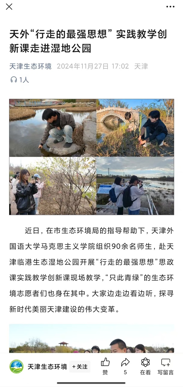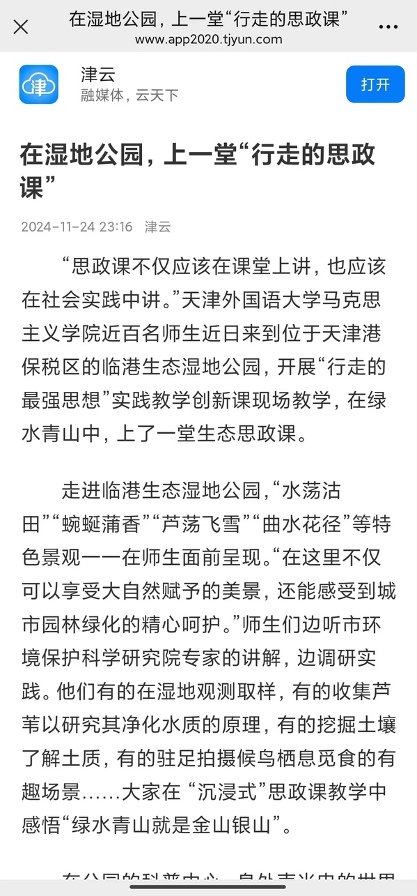 近日,米兰网页版马克思主义学院近百名师生来到位于天津港保税区的临港生态湿地公园,开展“行走的最强思想”实践教学创新课现场教学,在绿水青山中,上了一堂生态思政课。这次实践活动是天外积极探索更好地把生态文明教育深度融入“大思政课”、推动习近平生态文明思想在高校思政课堂上美丽绽放的有益尝试。本次活动受到了《中国日报》《天津日报》、津云、《天津教育报》、天津生态环境微信公众号等多家媒体的关注和报道。